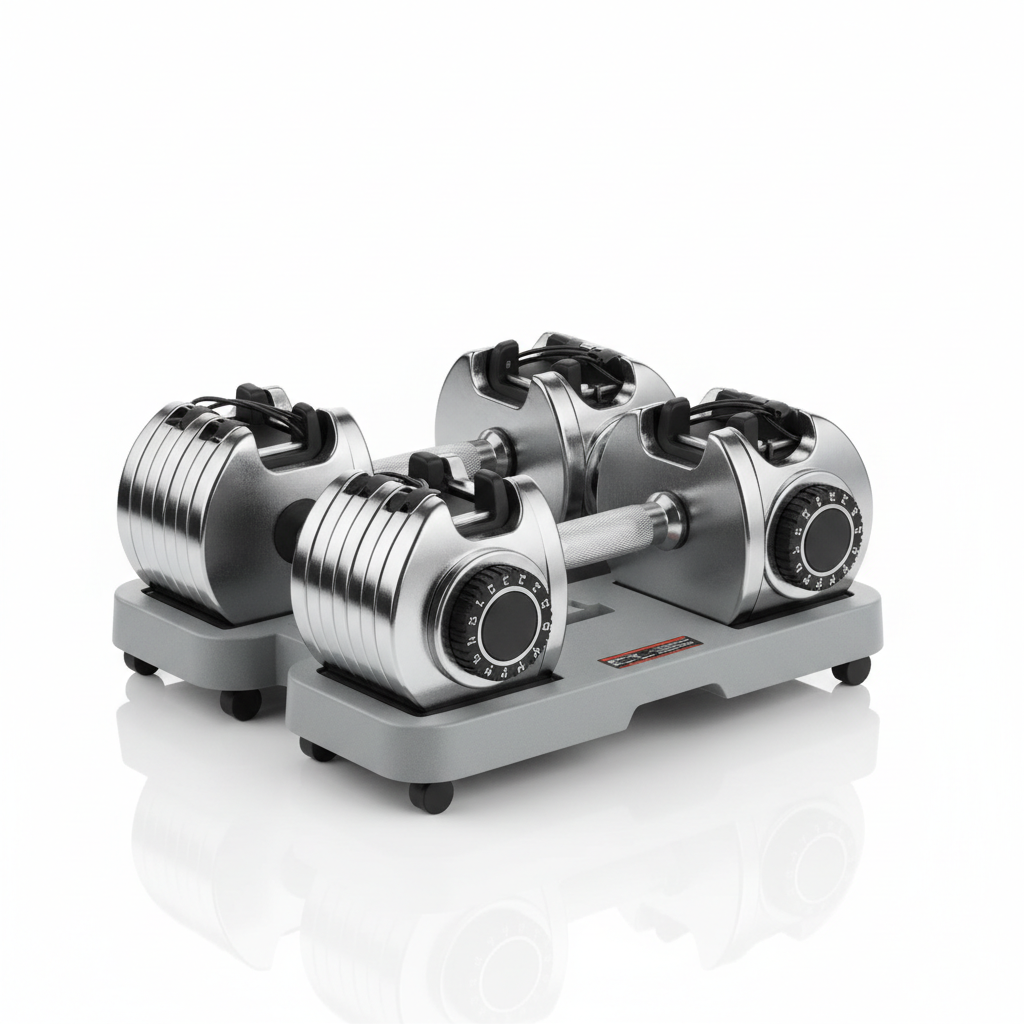 Set de mancuernas ajustables profesionales de 5 a 52.5 lbs por mancuerna. Tu gimnasio completo en casa con ahorro de espacio.
